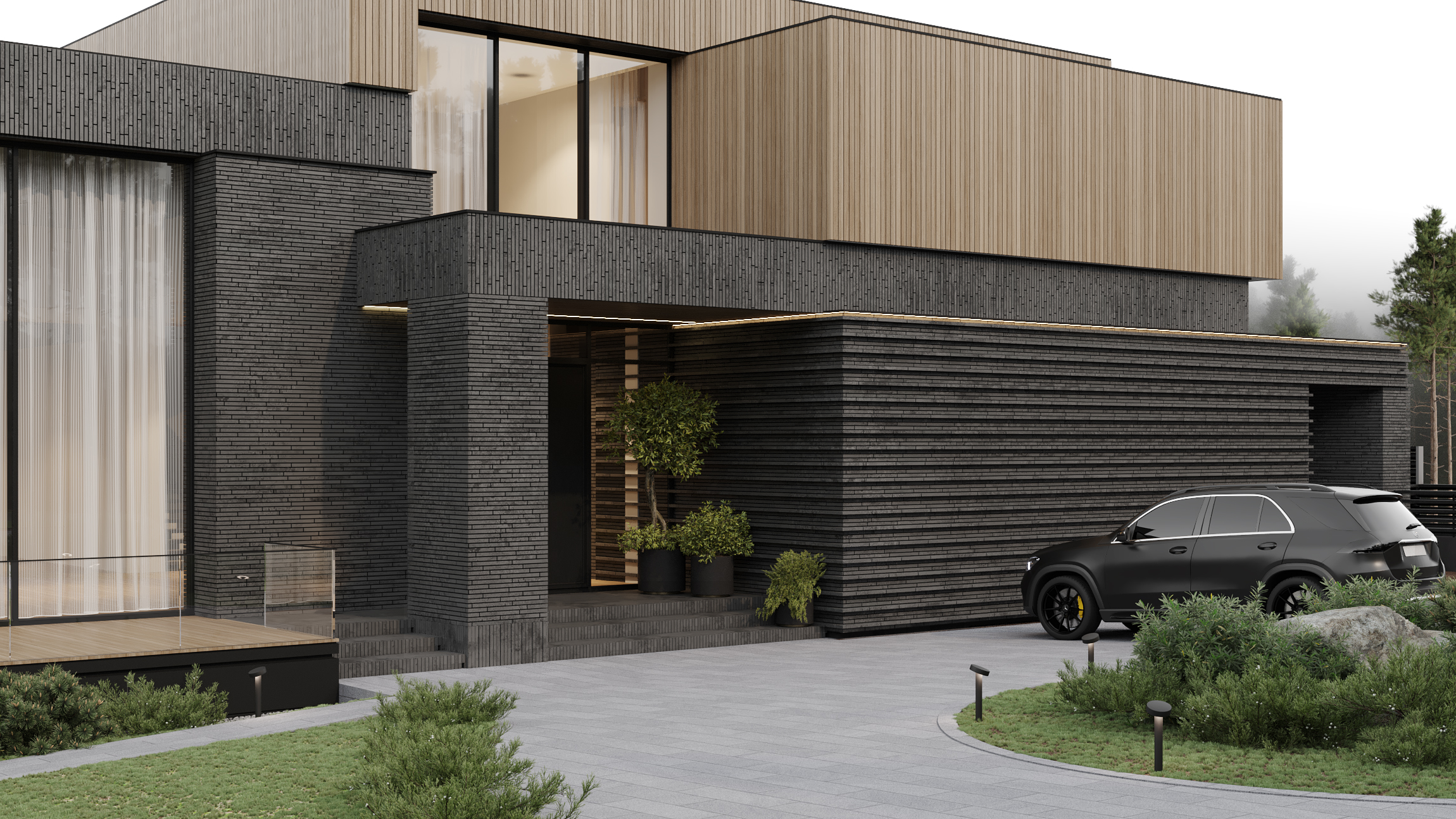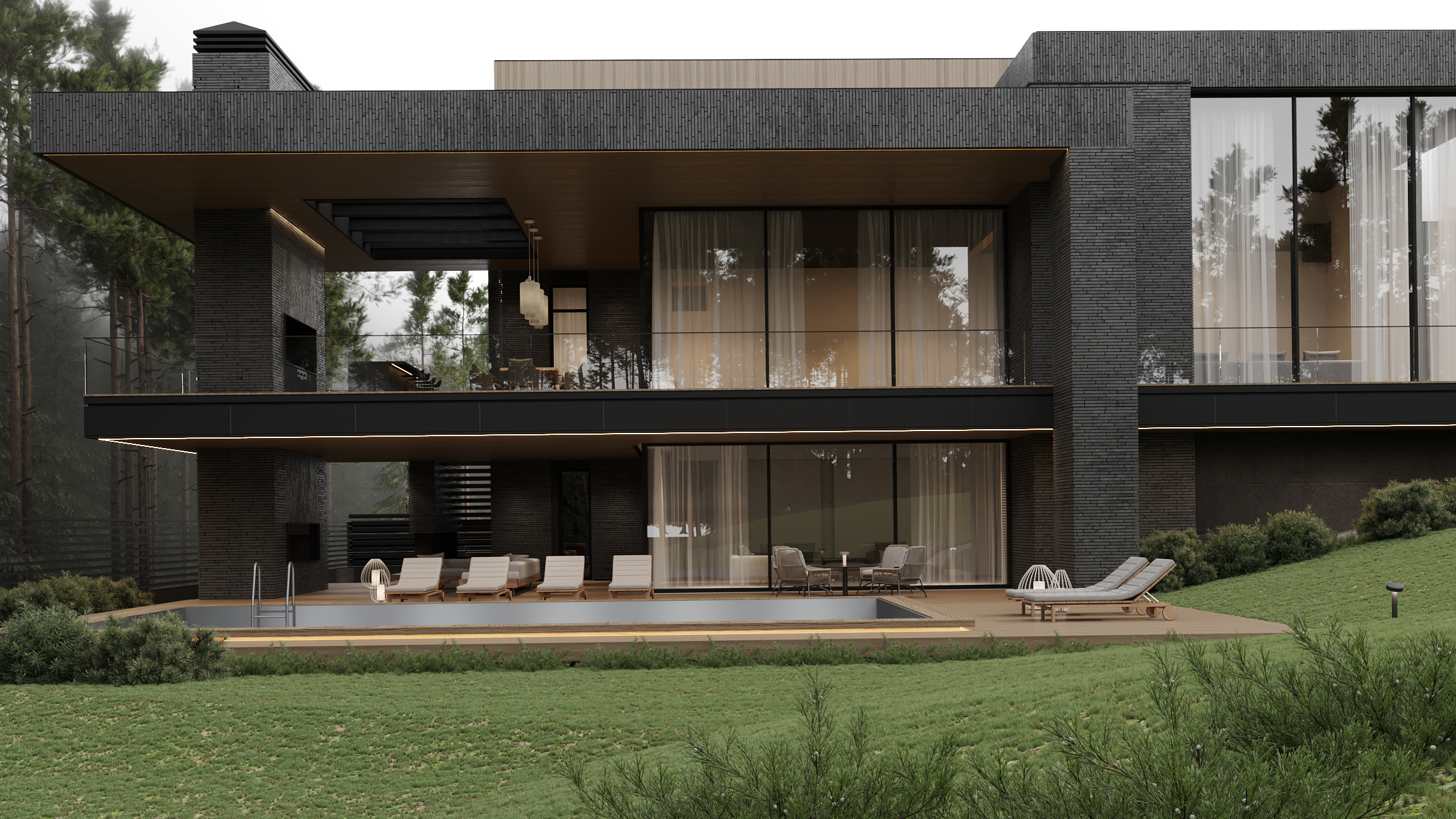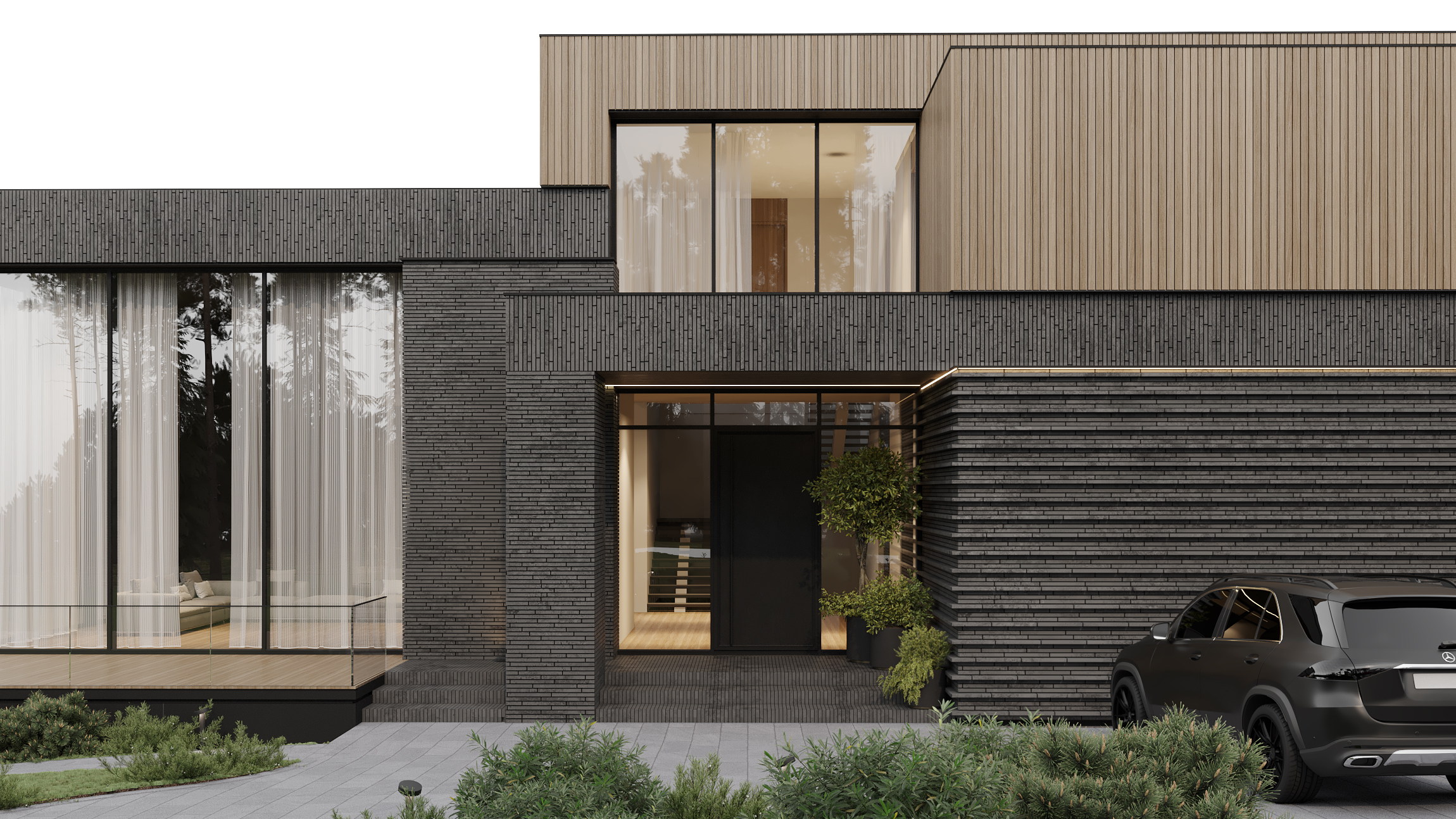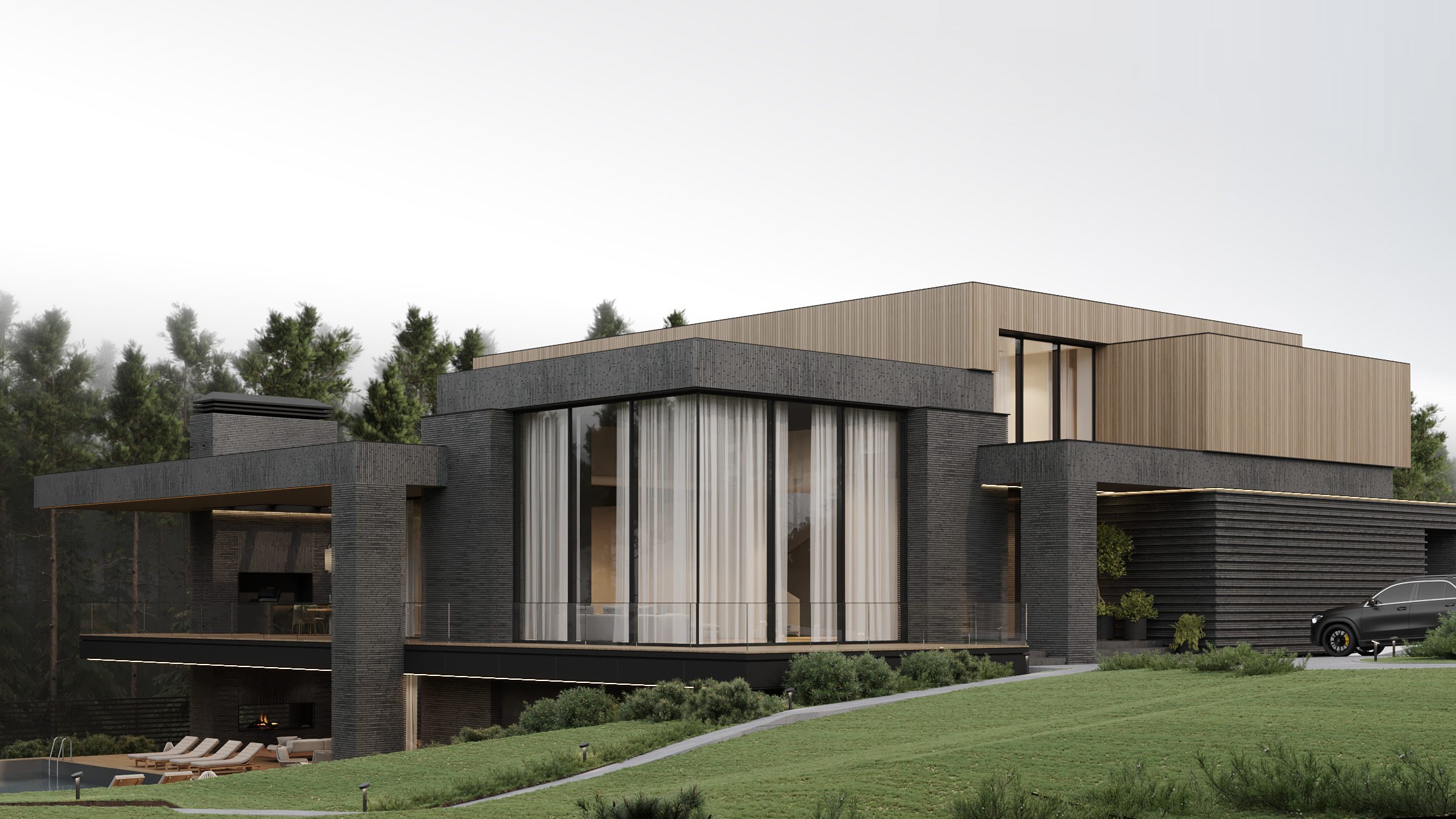 Загородная резиденция, утопающая в зелени, вписана в живописный ландшафт. Дом, расположенный на участке с выраженным перепадом высоты, демонстрирует игру объемов и материалов. Архитектурный облик представляет собой гармоничное сочетание четких геометрических форм, отражающих особенности рельефа.