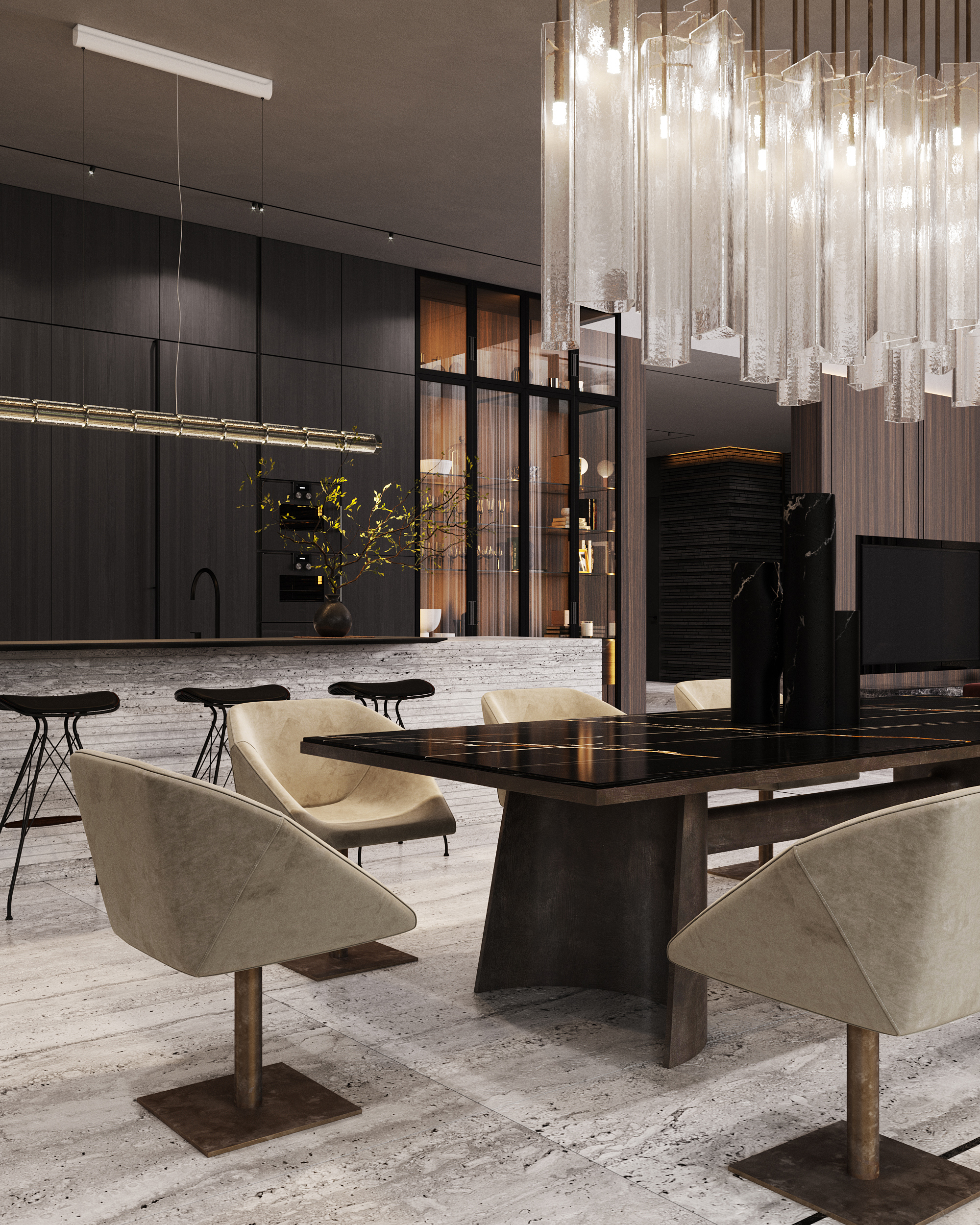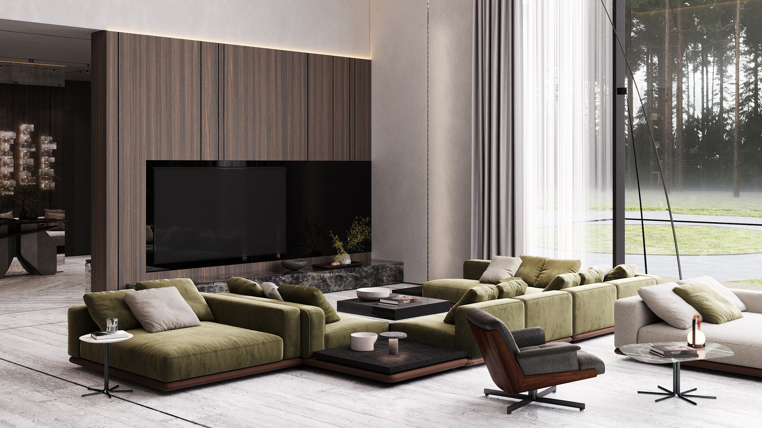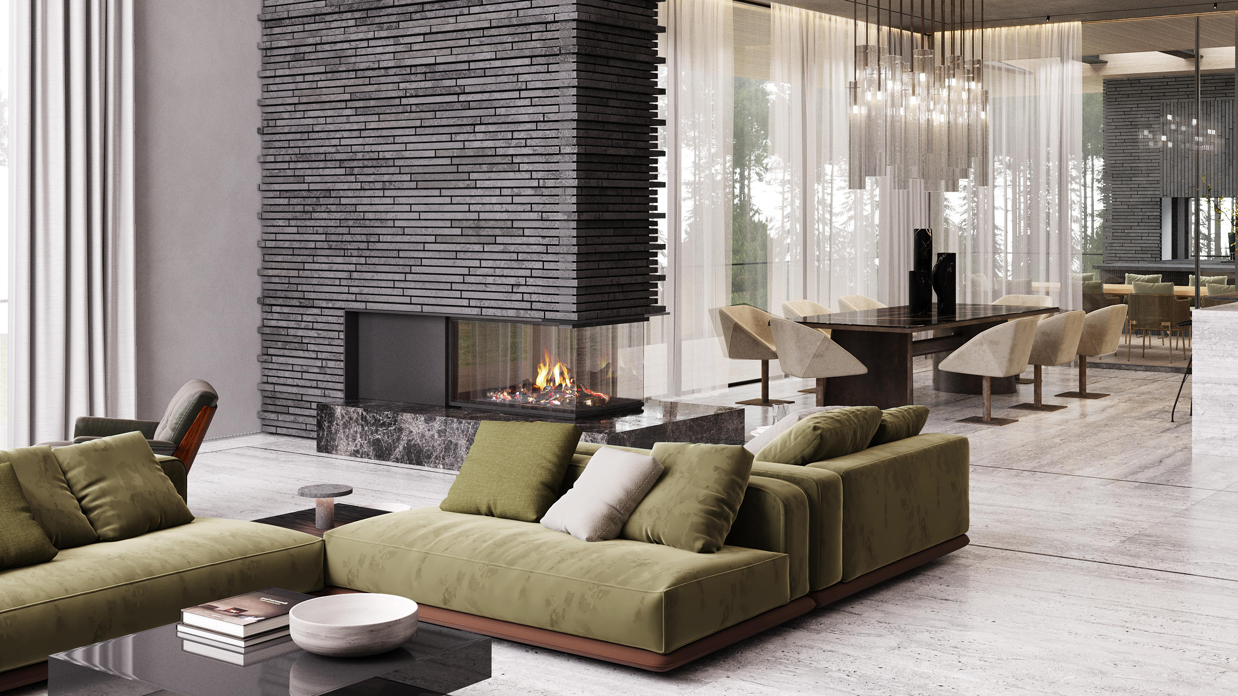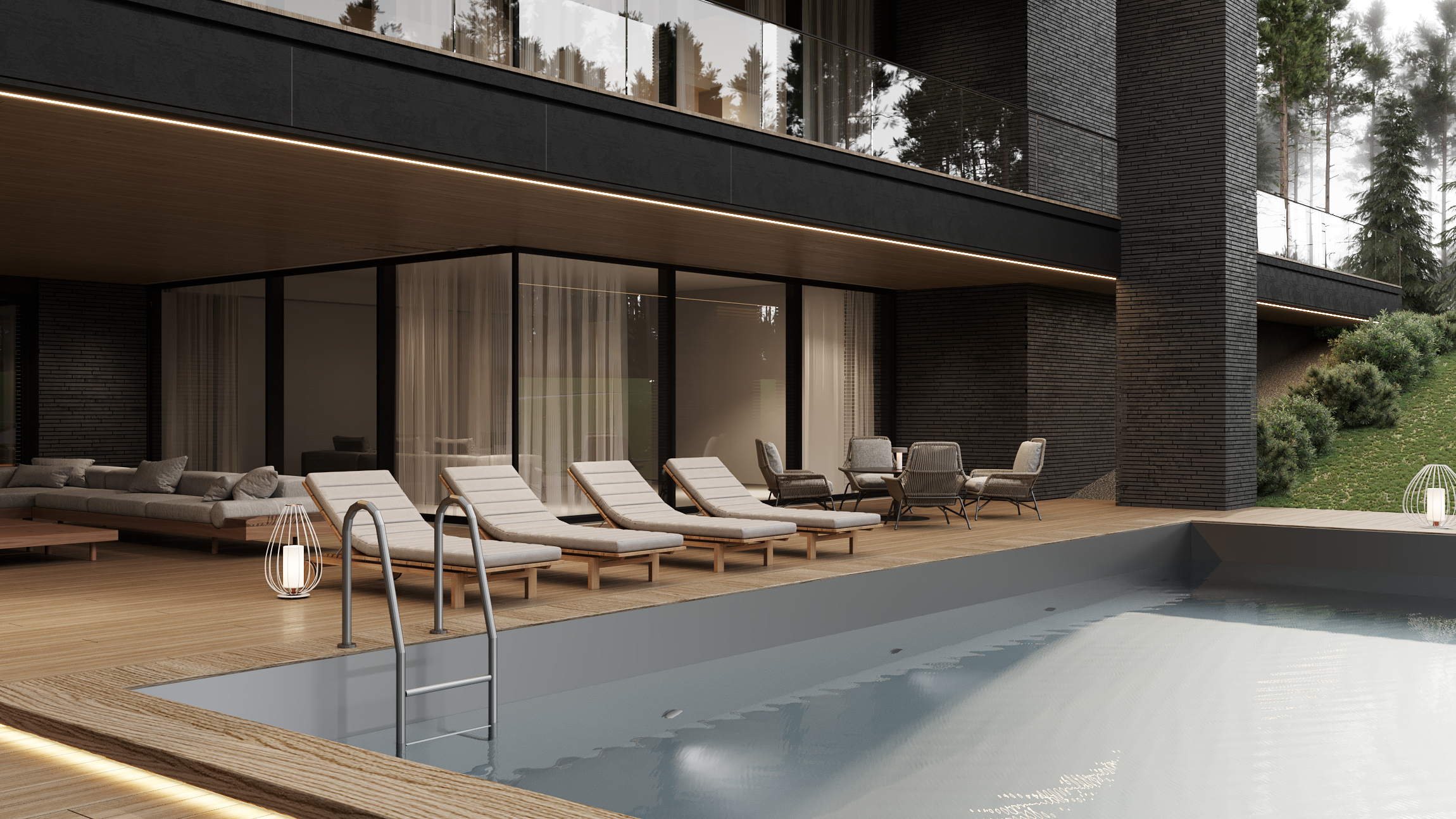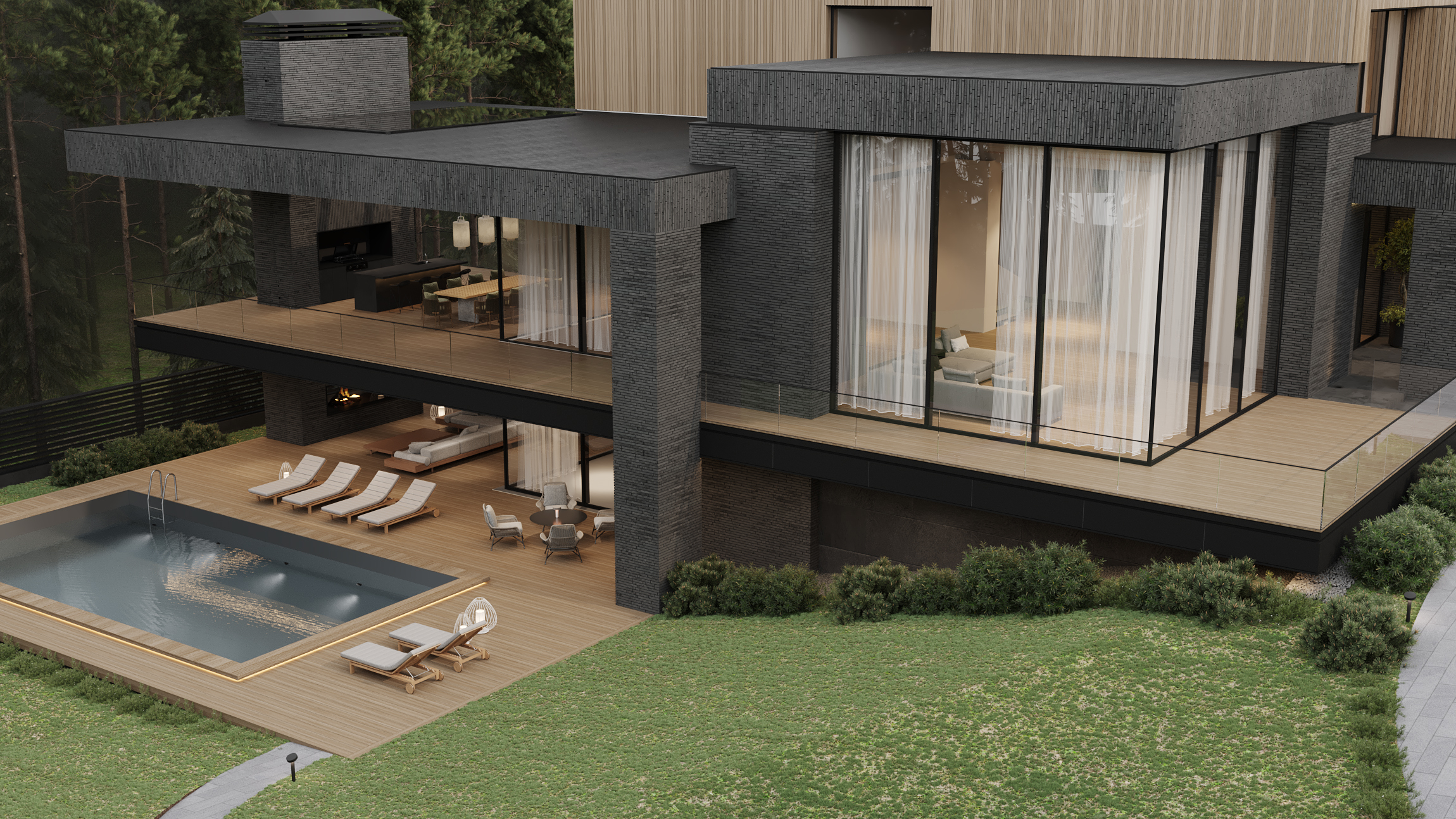 Загородная резиденция, утопающая в зелени, вписана в живописный ландшафт. Дом, расположенный на участке с выраженным перепадом высоты, демонстрирует игру объемов и материалов. Архитектурный облик представляет собой гармоничное сочетание четких геометрических форм, отражающих особенности рельефа.