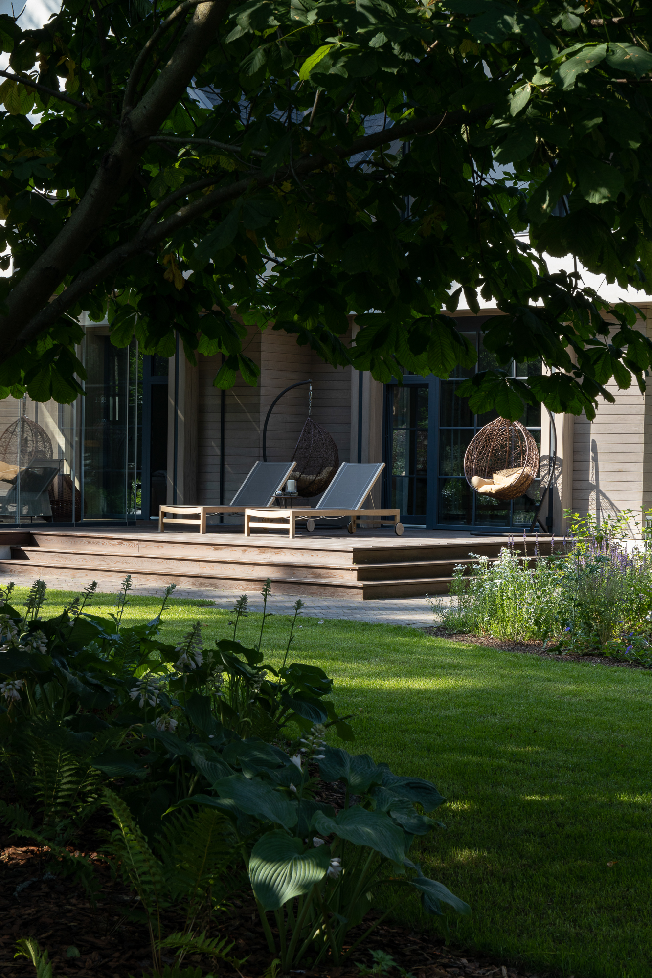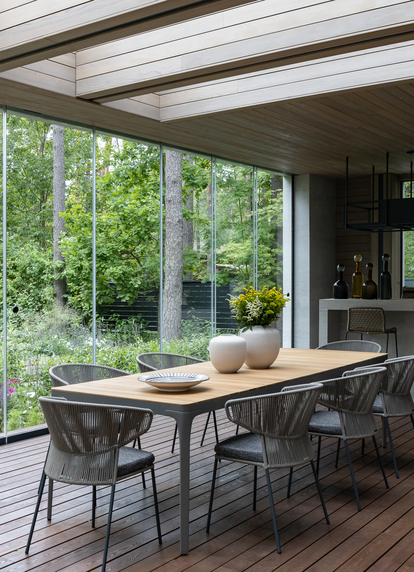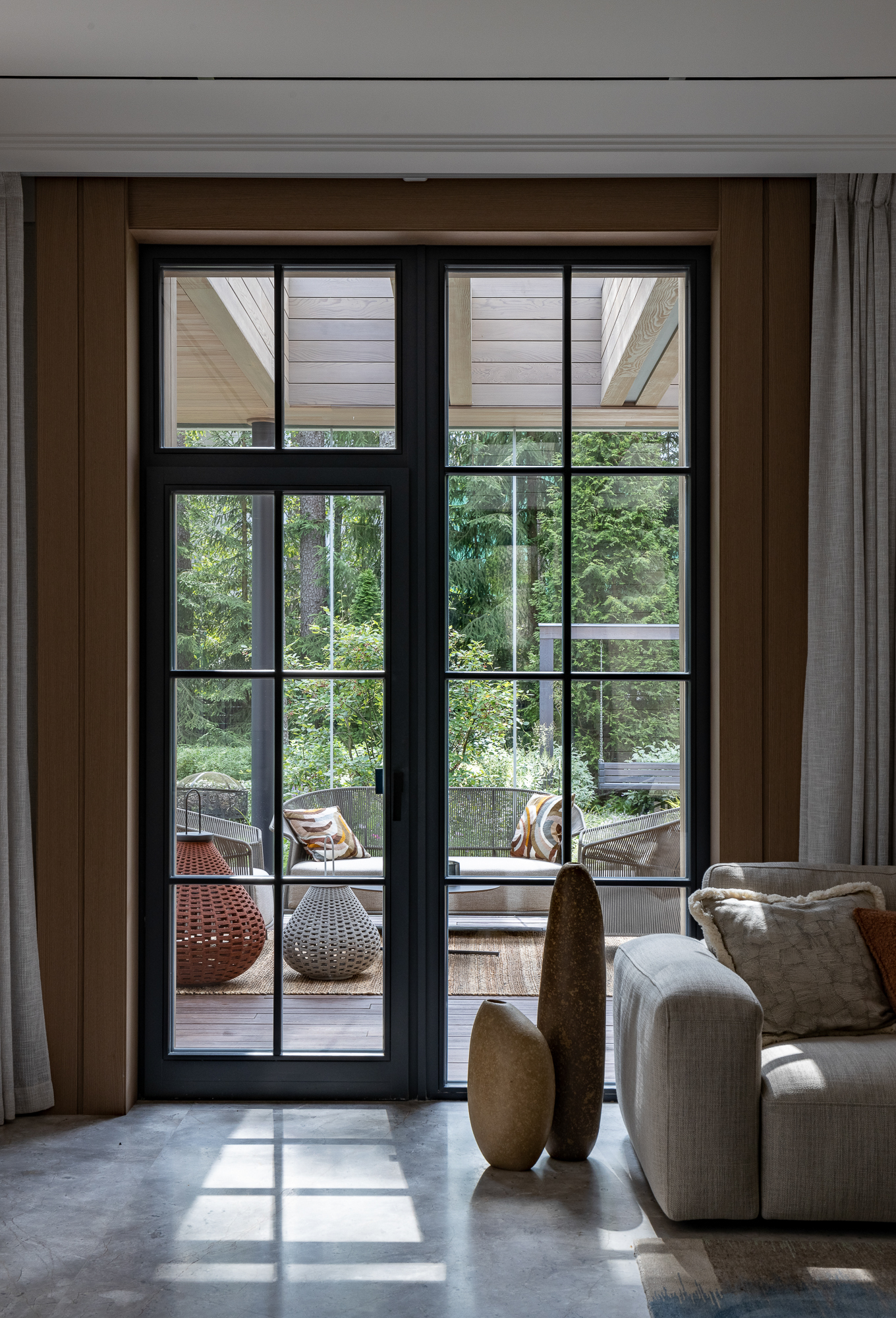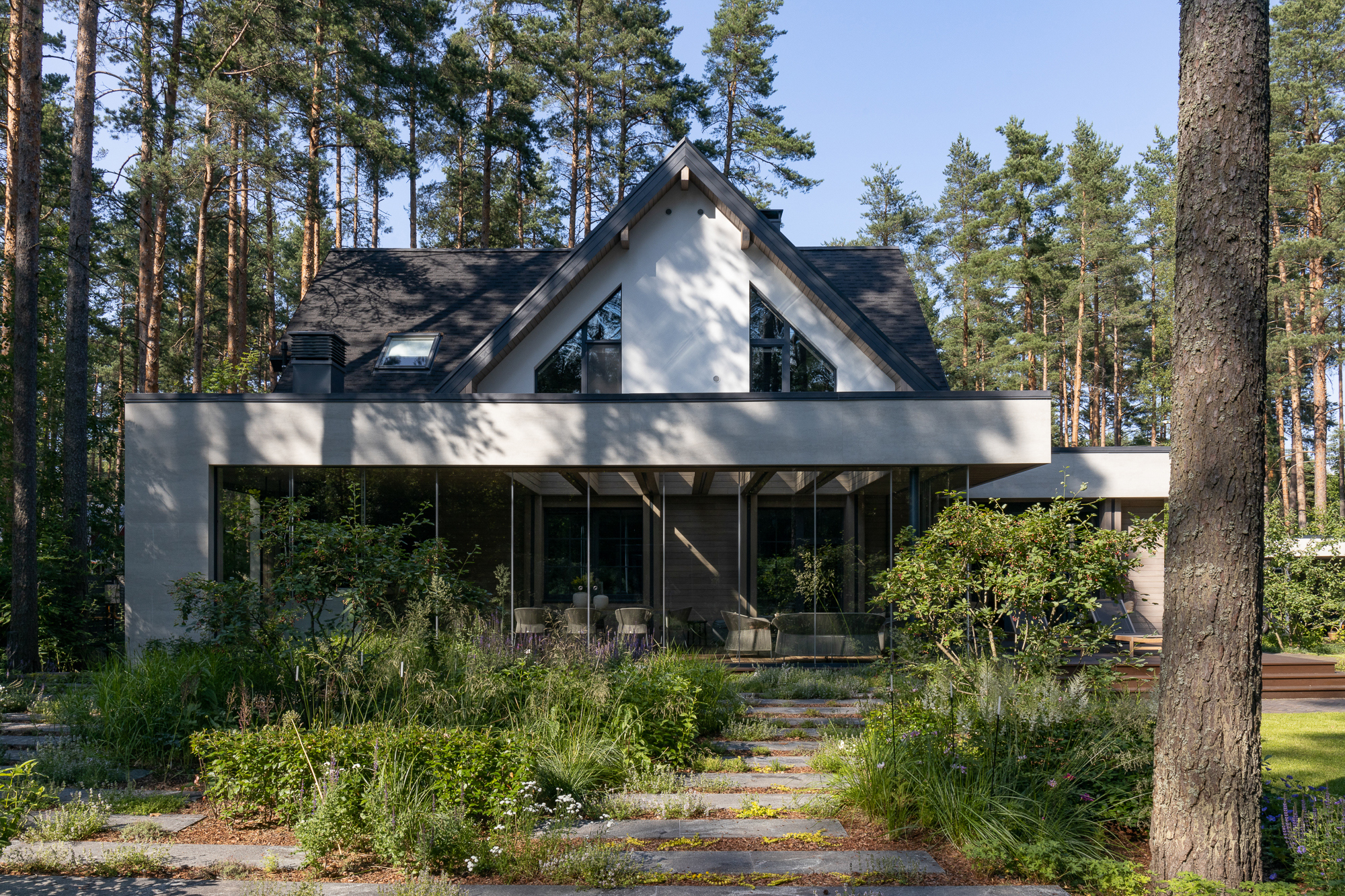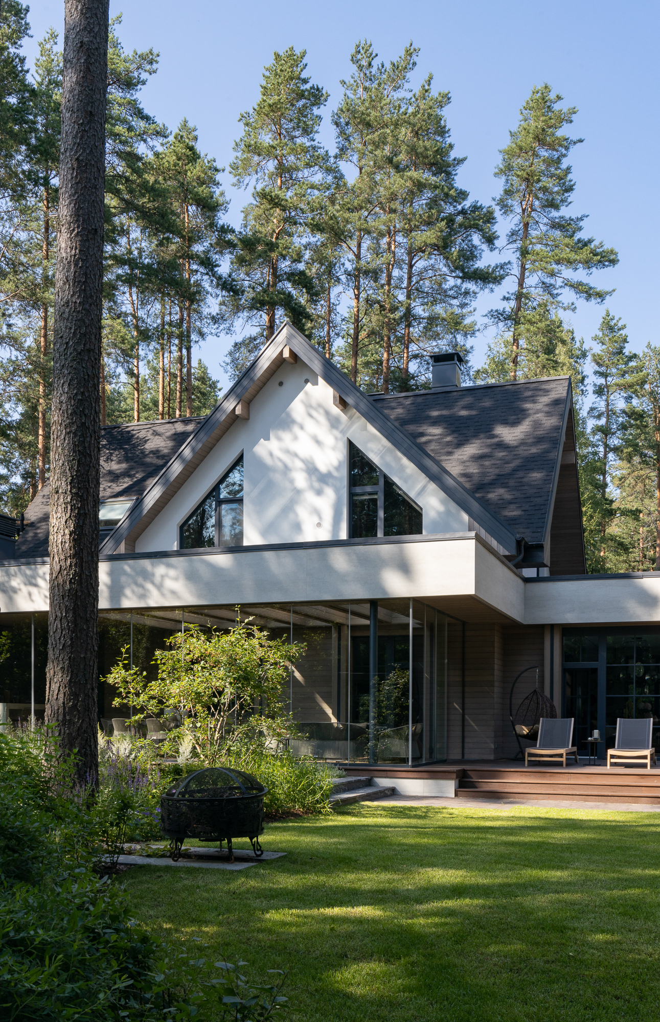 Результатом реконструкции стала просторная терраса с зонами барбекю и отдыха, ориентированная на живописный травяной сад и сосновый бор. К дому пристроена просторная кухня-столовая с выходом на террасу. Первый этаж занимает общественная зона и мастер блок, на втором этаже расположены каминная, гостевая спальня, детская и кабинет. Для облицовки фасадов использован широкоформатный керамогранит и планкен из термоясеня сложного пыльно-бежевого оттенка. Цветовая гамма фасадов гармонично сочетается с окружающей природой: сложное серо-дымчатое сочетание отделок словно растворяется на фоне величественных сосен. Двускатная кровля была отреставрирована, а покрытие крыши заменено на новое.