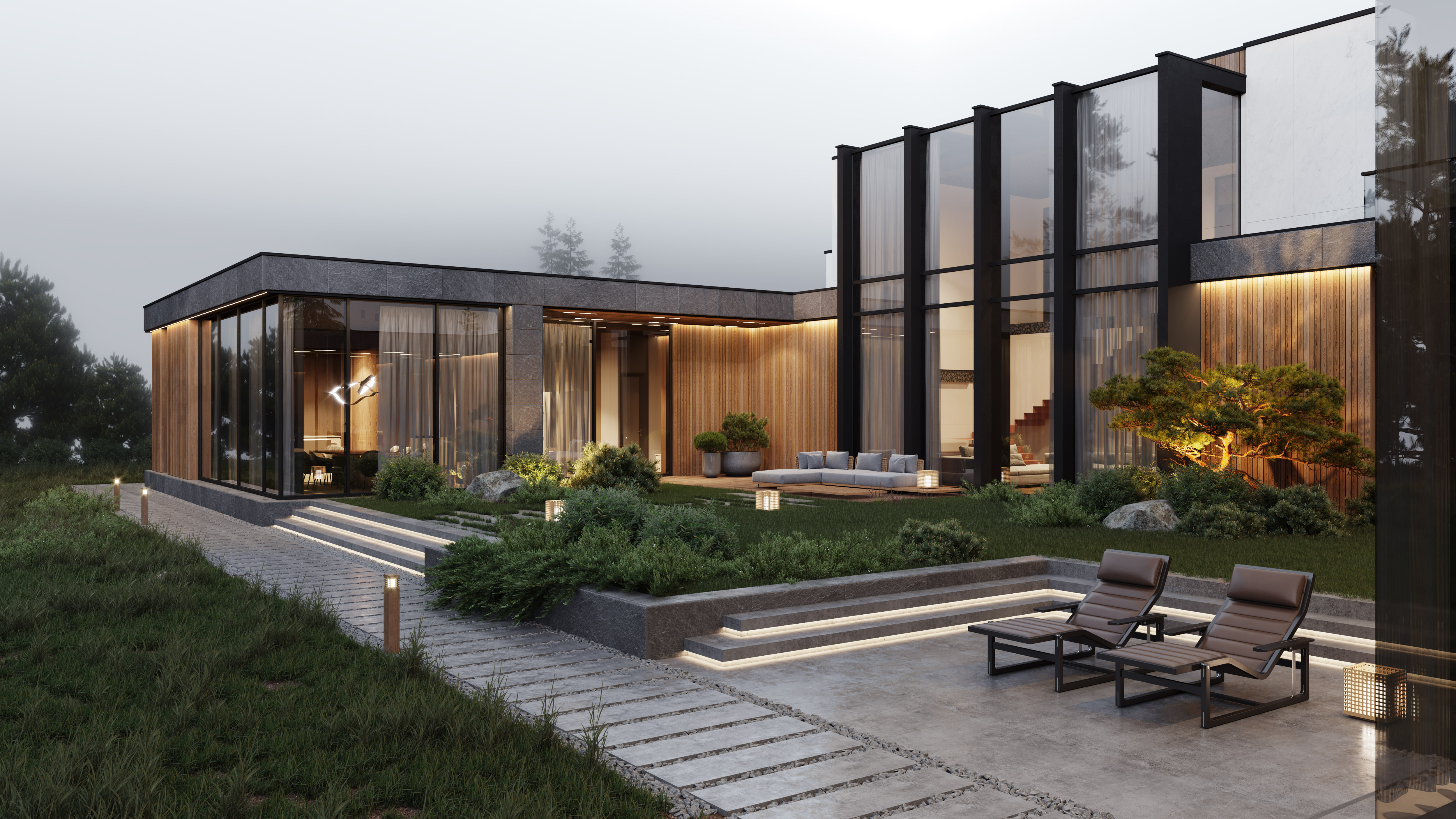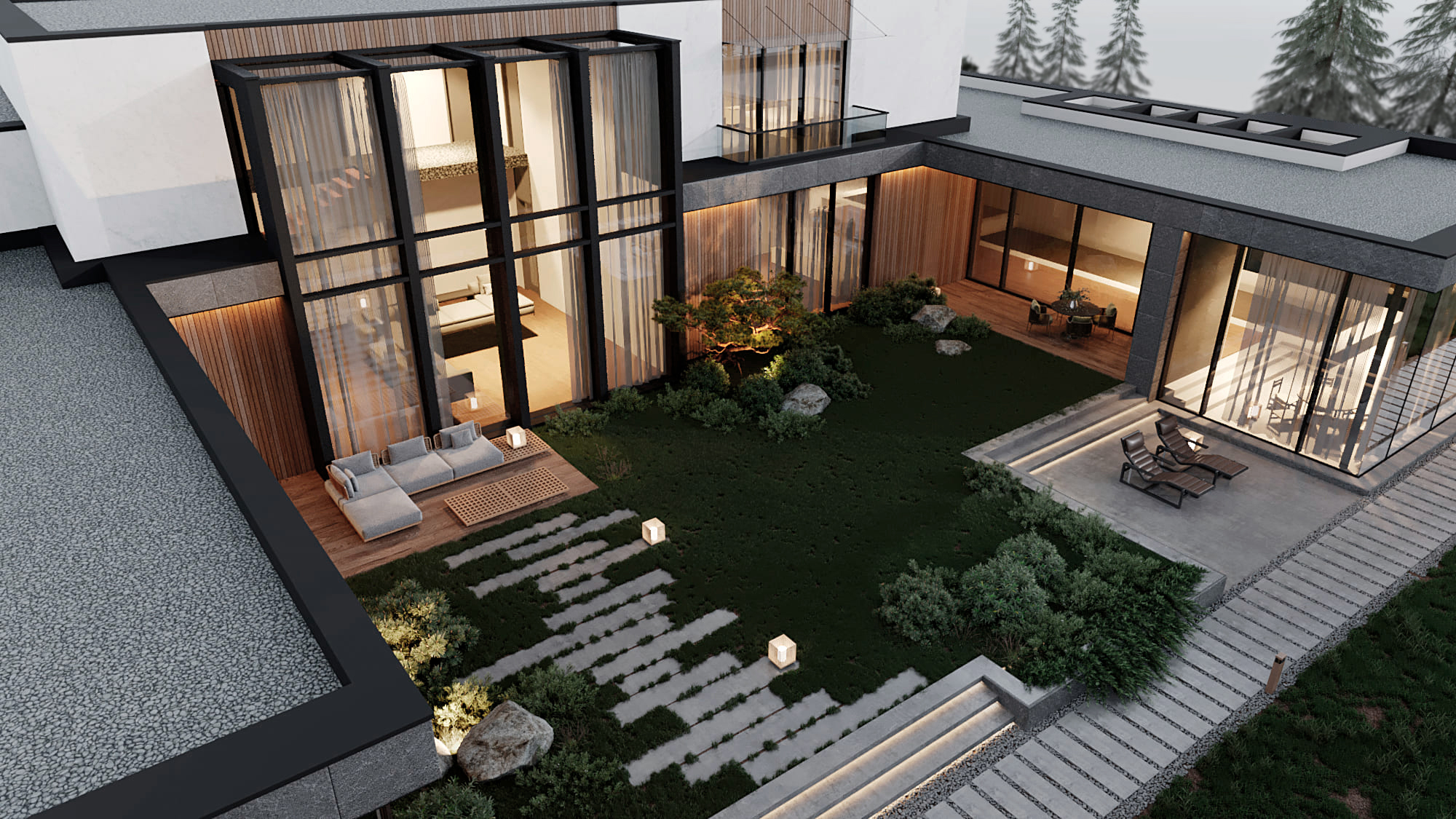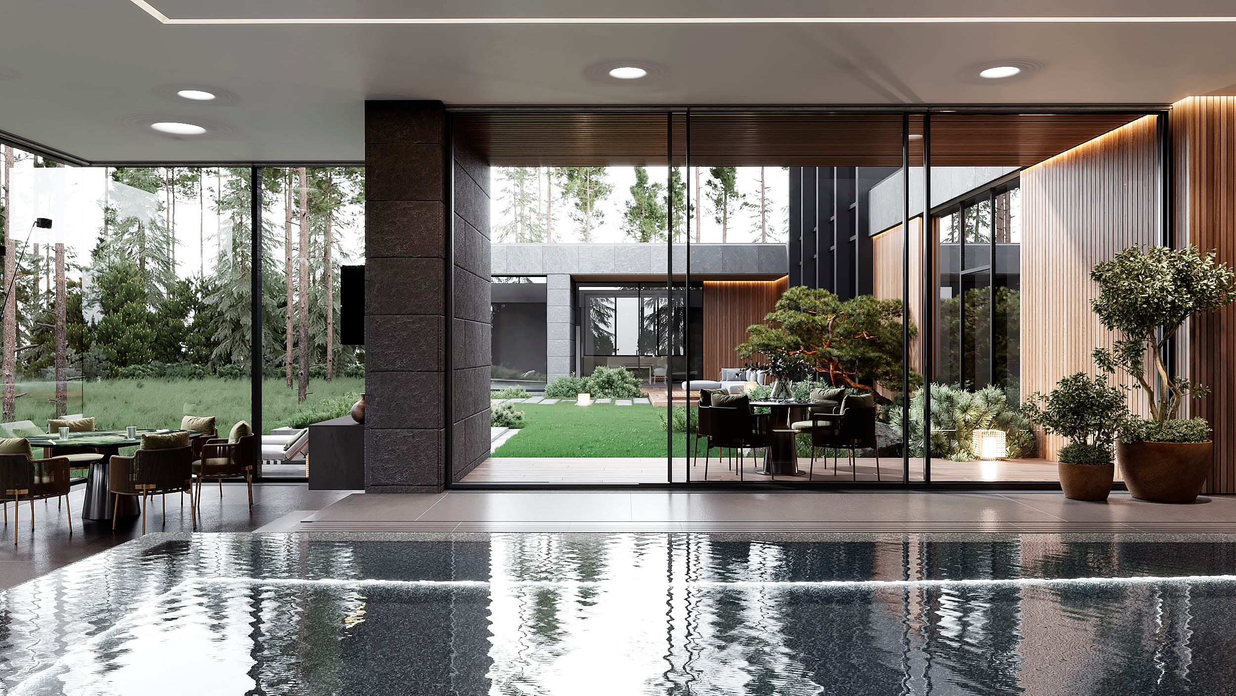 Функциональное зонирование дома подчинено принципу максимального комфорта. Сердцем планировки является внутренний озелененный двор, обеспечивающий визуальную и физическую связь с нетронутым лесным массивом. Все основные помещения первого этажа – мастер-блок, гостиная, кухня и столовая – спроектированы таким образом, чтобы обеспечить непосредственный доступ во внутренний двор. Это позволяет в любой момент выйти на свежий воздух, ощутить аромат трав и насладиться тишиной природы. Зона спа также имеет выход во дворик, предлагая возможность для уединенных солнечных ванн. Весь второй этаж предназначен для детских мастер-блоков, обеспечивая им приватное и комфортное пространство для жизни и развития. В отделке фасадов использованы натуральные материалы, такие как планкен теплых оттенков и керамогранит, подчеркивающие эстетику природного окружения. Отделка фасада плавно переходит в спа-зону, визуально объединяя экстерьер и зону отдыха. Инфинити-бассейн с переливным краем создает эффект визуального слияния с окружающим лесным массивом. Резиденция в Охта Парке представляет собой уникальное пространство для жизни, где архитектура и природа образуют единое целое.