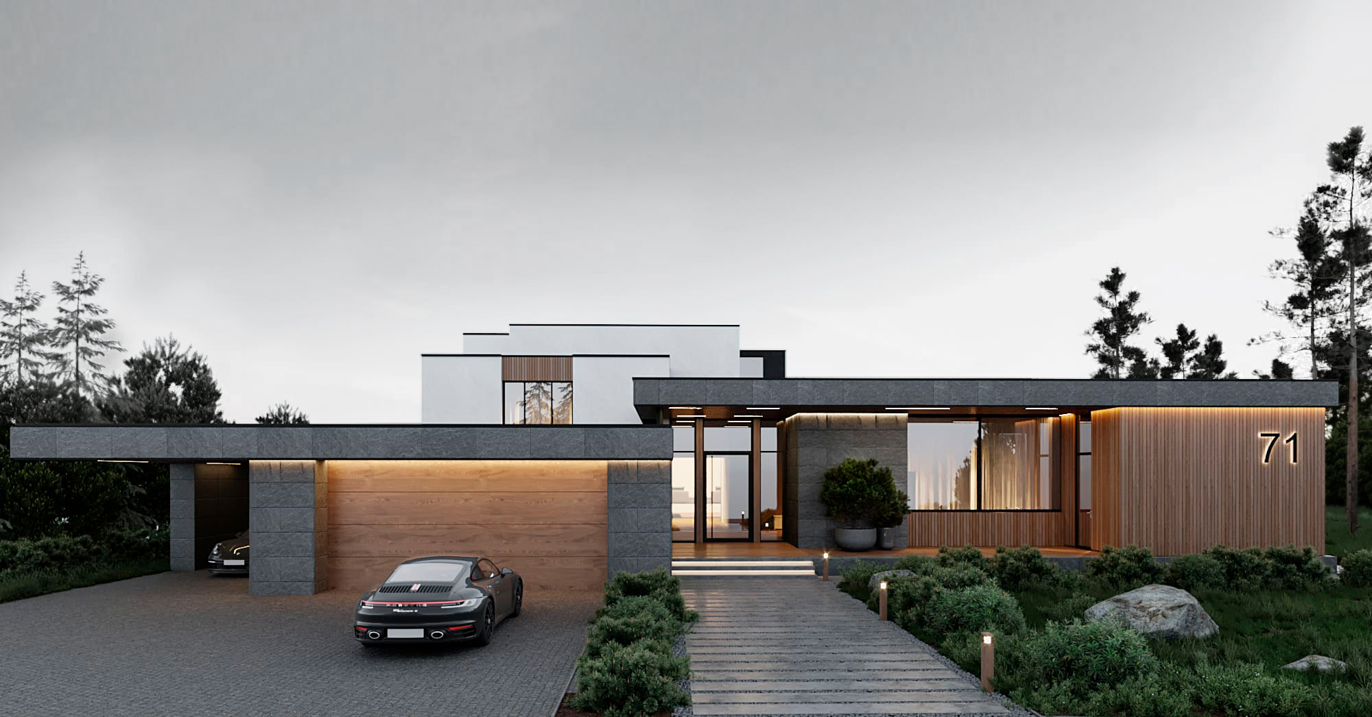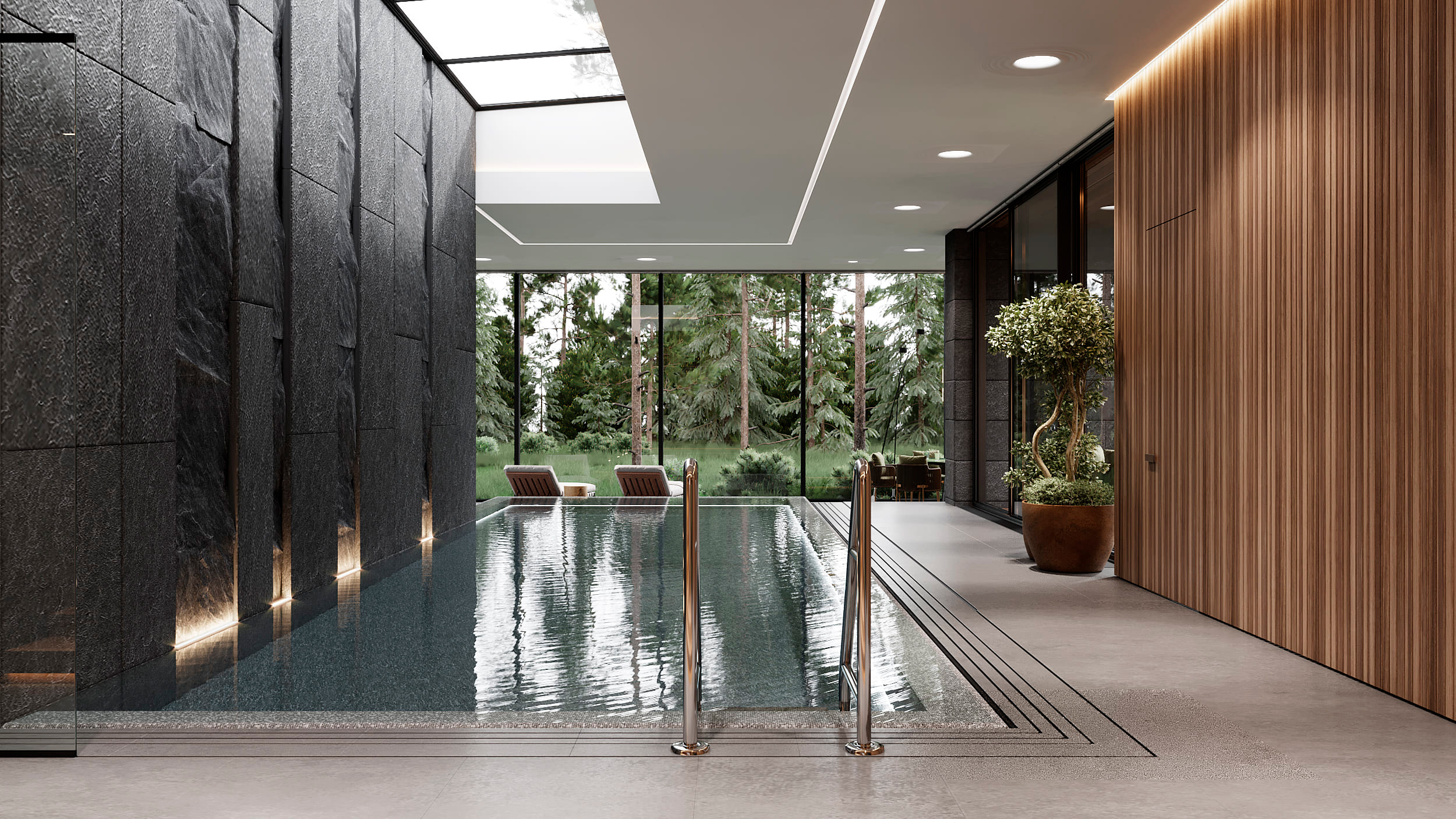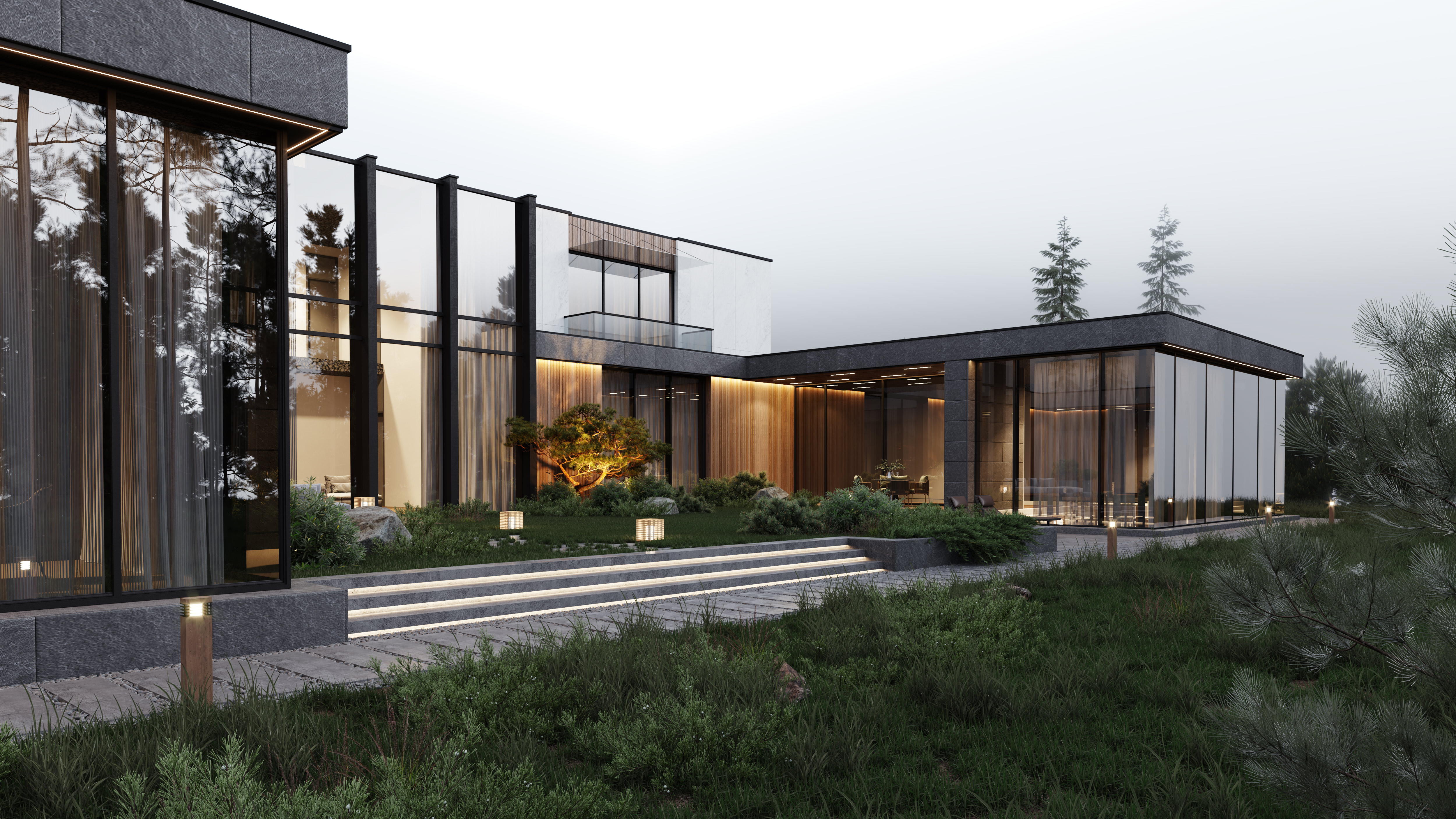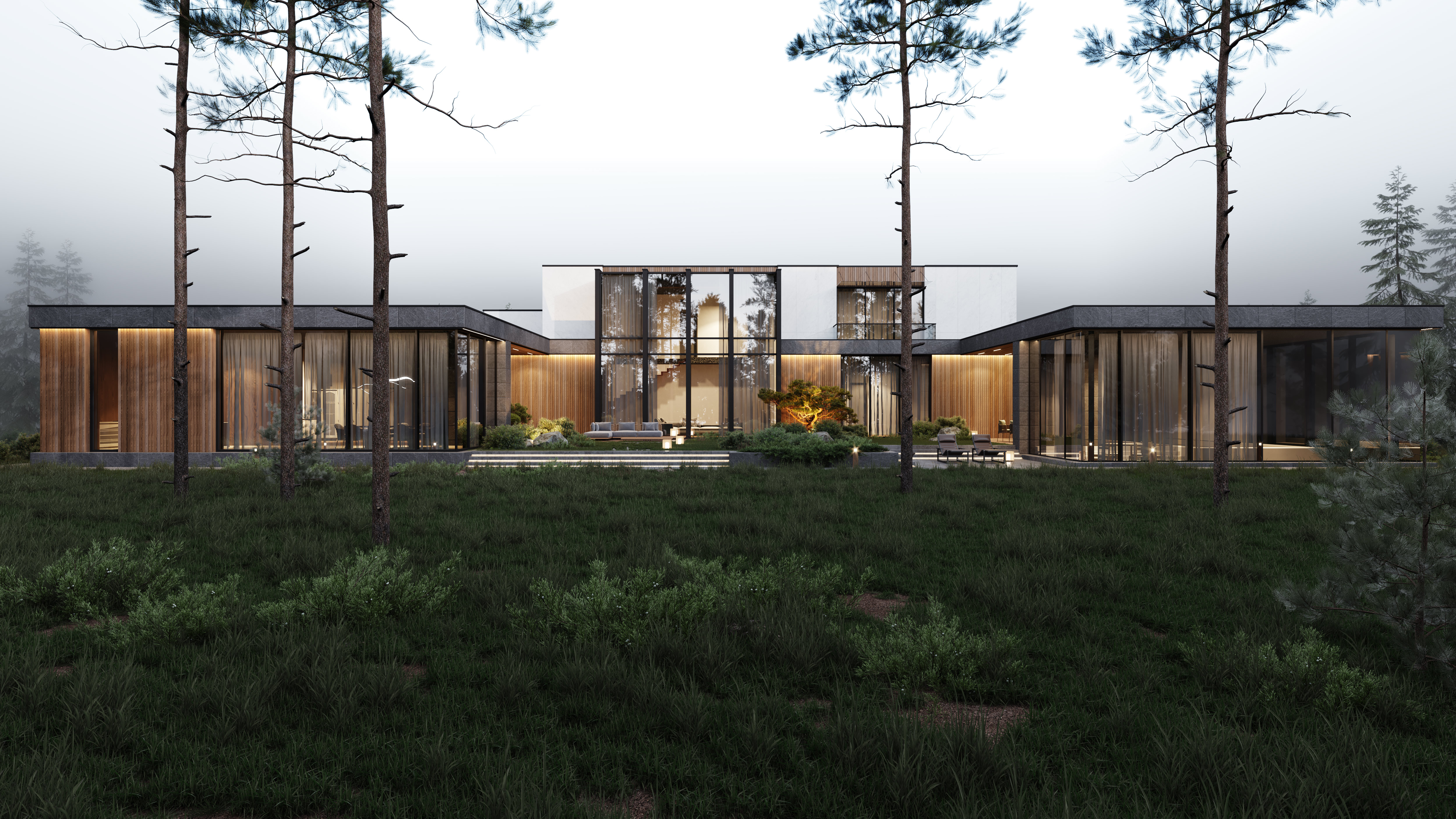 Функциональное зонирование дома подчинено принципу максимального комфорта. Сердцем планировки является внутренний озелененный двор, обеспечивающий визуальную и физическую связь с нетронутым лесным массивом. Все основные помещения первого этажа – мастер-блок, гостиная, кухня и столовая – спроектированы таким образом, чтобы обеспечить непосредственный доступ во внутренний двор. Это позволяет в любой момент выйти на свежий воздух, ощутить аромат трав и насладиться тишиной природы. Зона спа также имеет выход во дворик, предлагая возможность для уединенных солнечных ванн. Весь второй этаж предназначен для детских мастер-блоков, обеспечивая им приватное и комфортное пространство для жизни и развития. В отделке фасадов использованы натуральные материалы, такие как планкен теплых оттенков и керамогранит, подчеркивающие эстетику природного окружения. Отделка фасада плавно переходит в спа-зону, визуально объединяя экстерьер и зону отдыха. Инфинити-бассейн с переливным краем создает эффект визуального слияния с окружающим лесным массивом. Резиденция в Охта Парке представляет собой уникальное пространство для жизни, где архитектура и природа образуют единое целое.