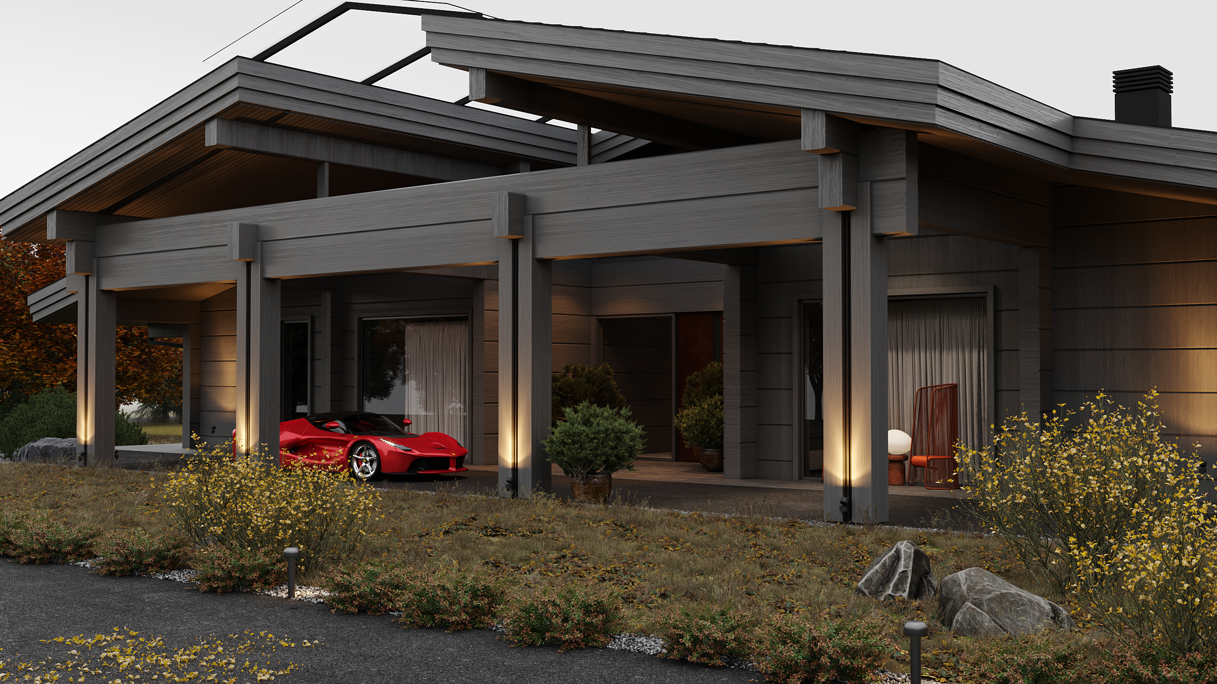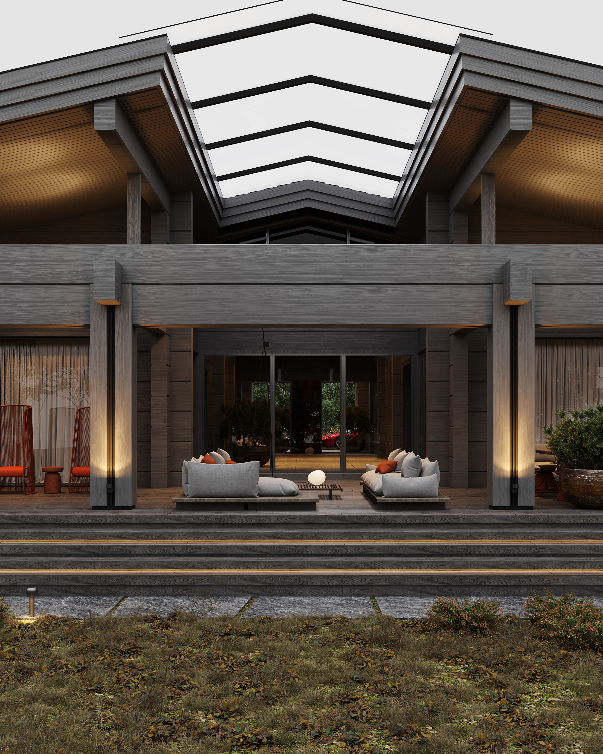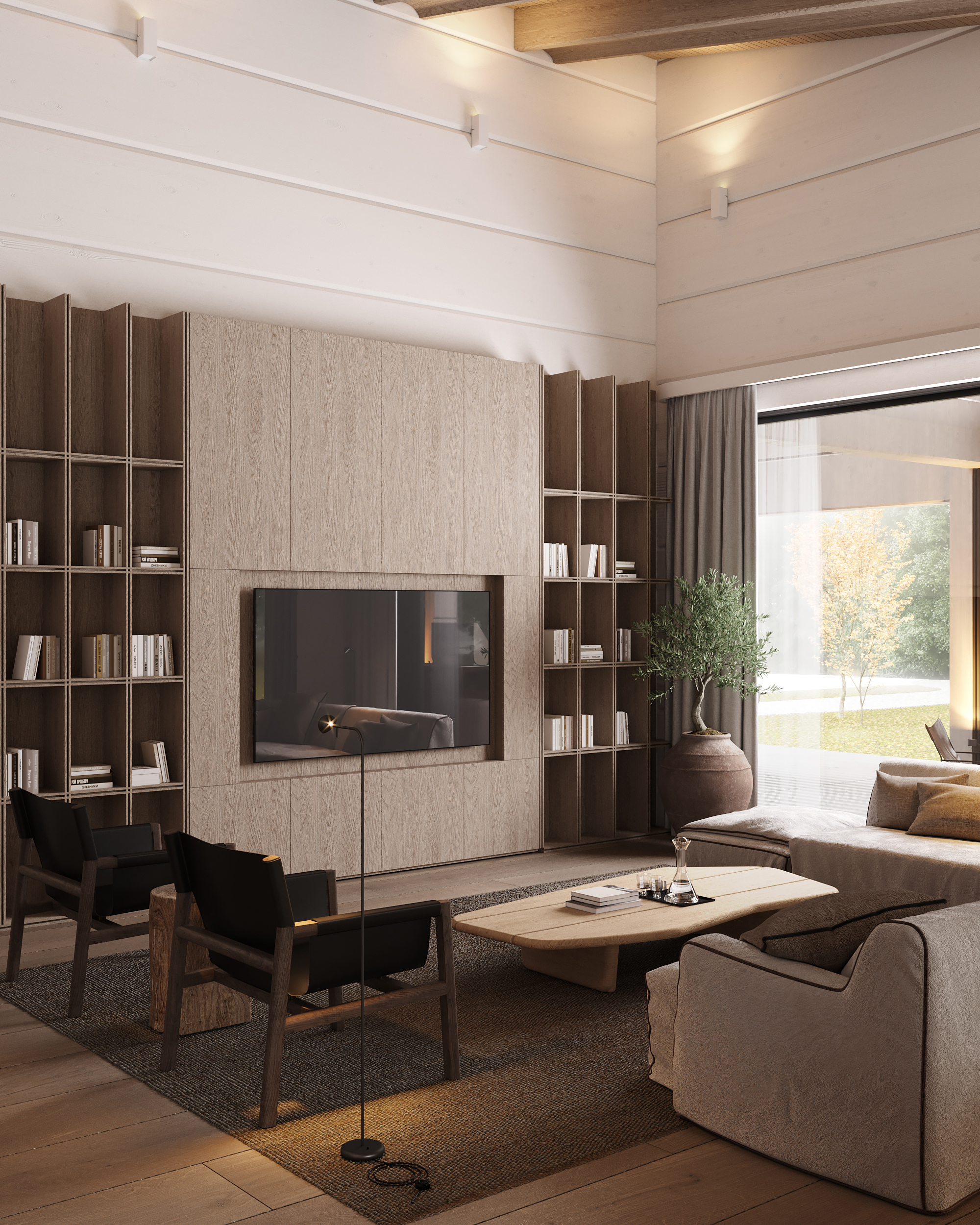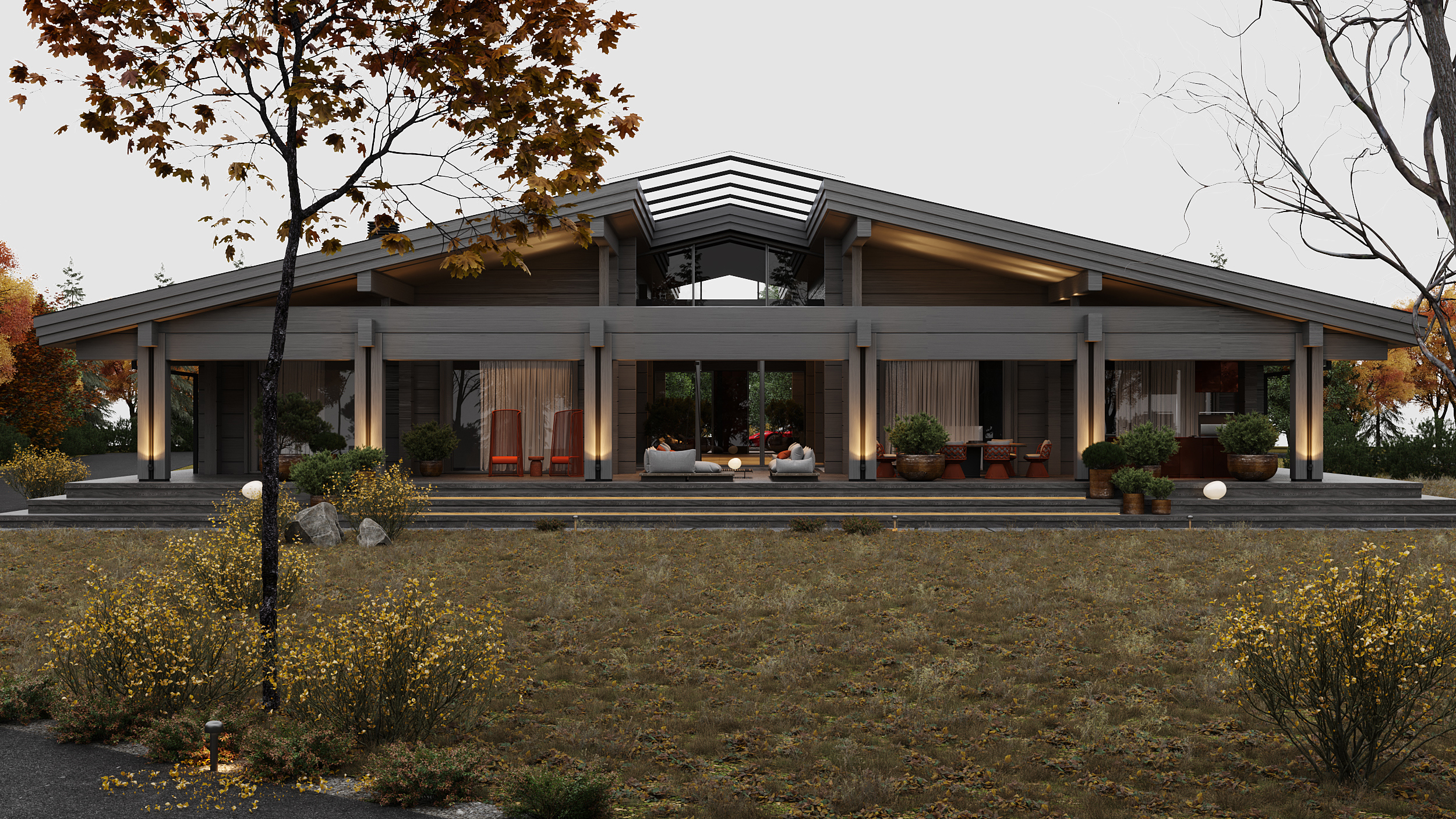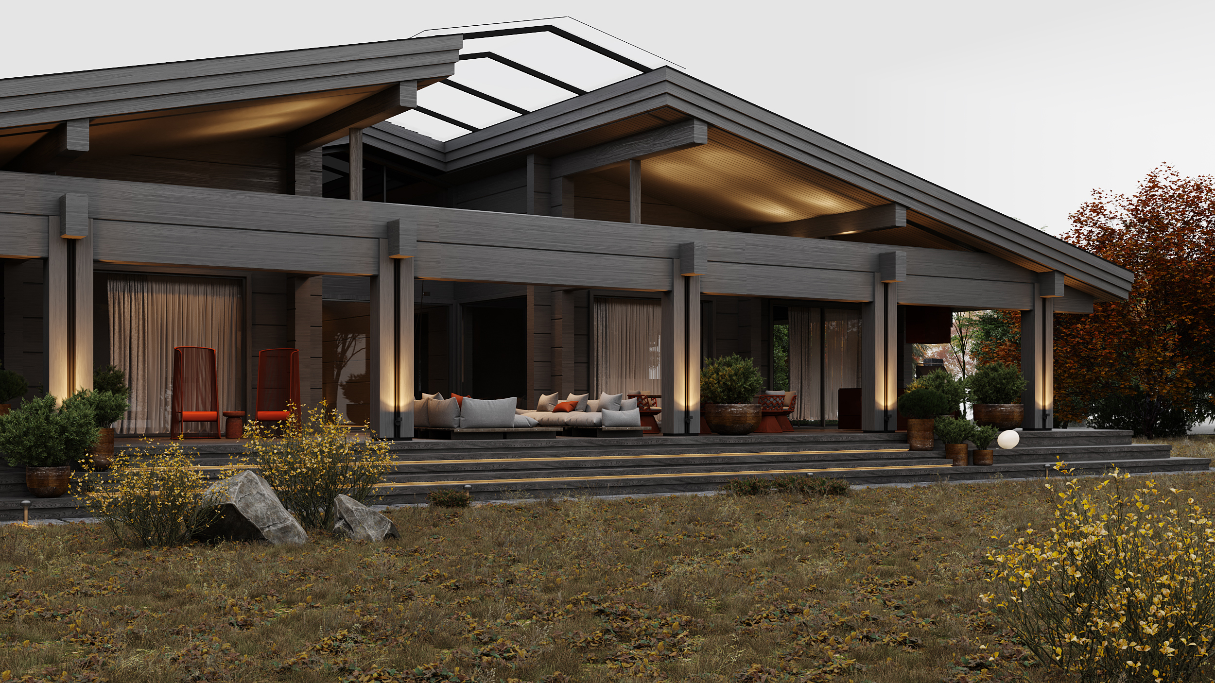Проект представляет собой современную интерпретацию традиционной деревенской избы, предлагая новое видение роскоши: расслабление и умиротворение, вдали от шума и забот повседневной жизни, в атмосфере, вдохновленной природными формами и предметами ремесла. Ключевая особенность проекта – использование бруса с крупным, нестандартным сечением (600 × 400 мм), изготовленного на заказ в Сибири. Этот массивный брус выглядит основательно и сомасштабен размерам дома (общая площадь которого составляет 1069 м², а высота потолков достигает 7,1 м), что отсылает нас к классическим деревянным домам северных регионов. В двускатную кровлю традиционной формы искусно интегрирован световой фонарь, наполняющий внутреннее пространство светом и воздухом.