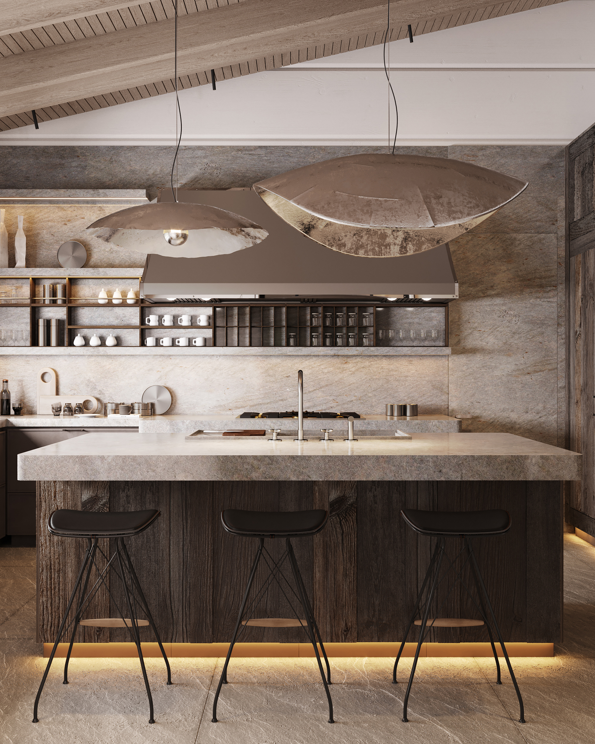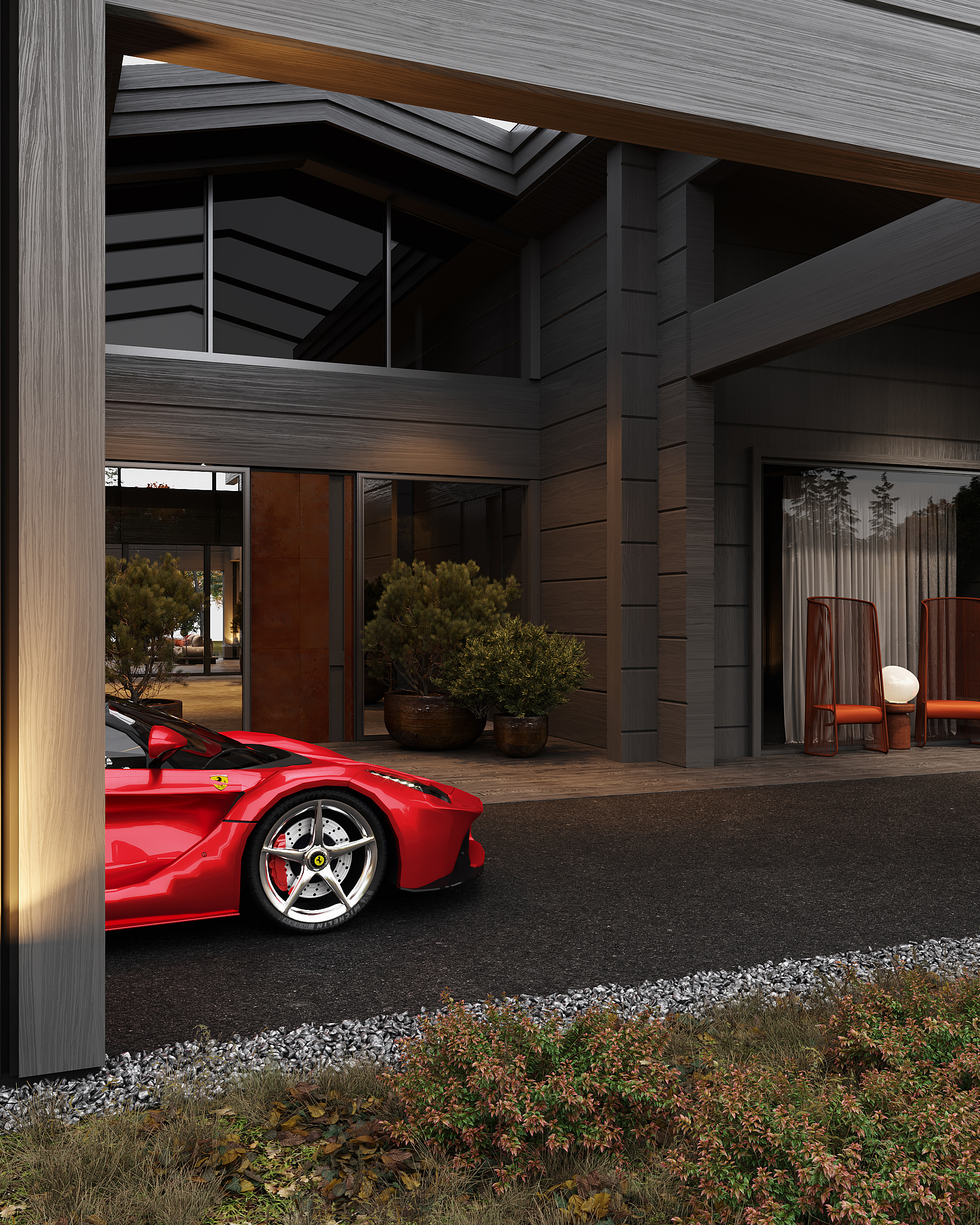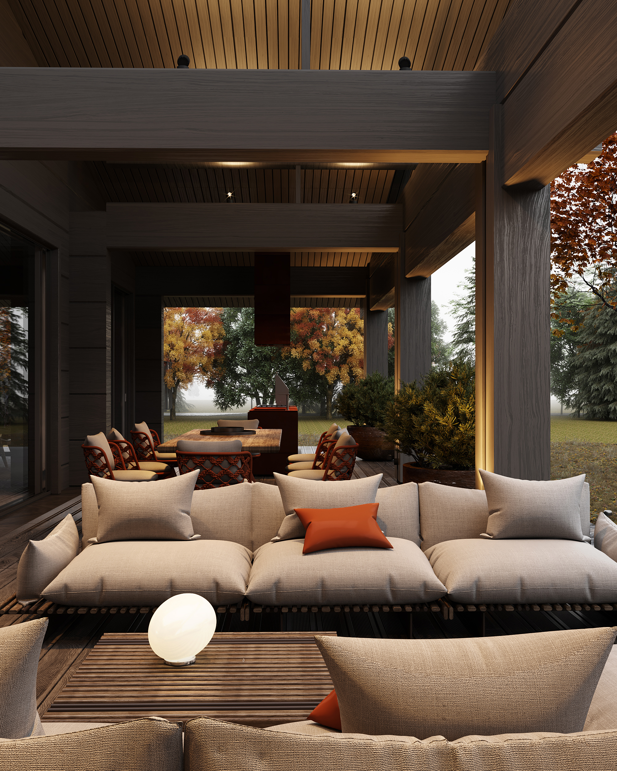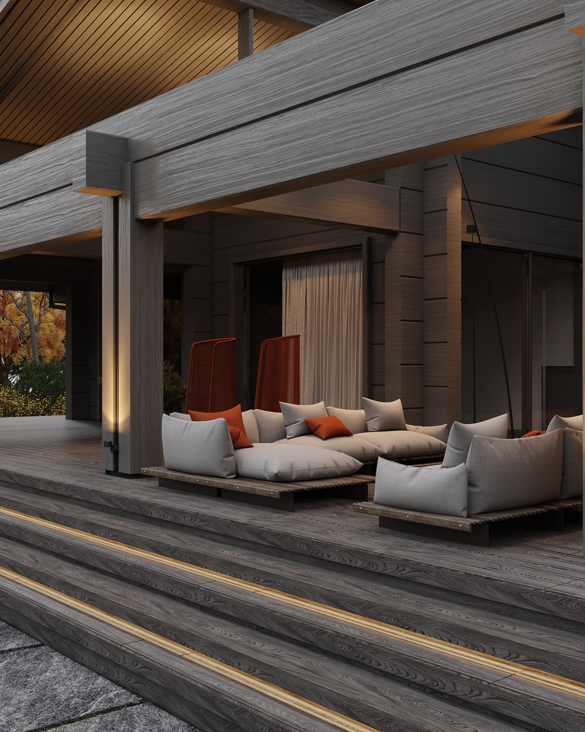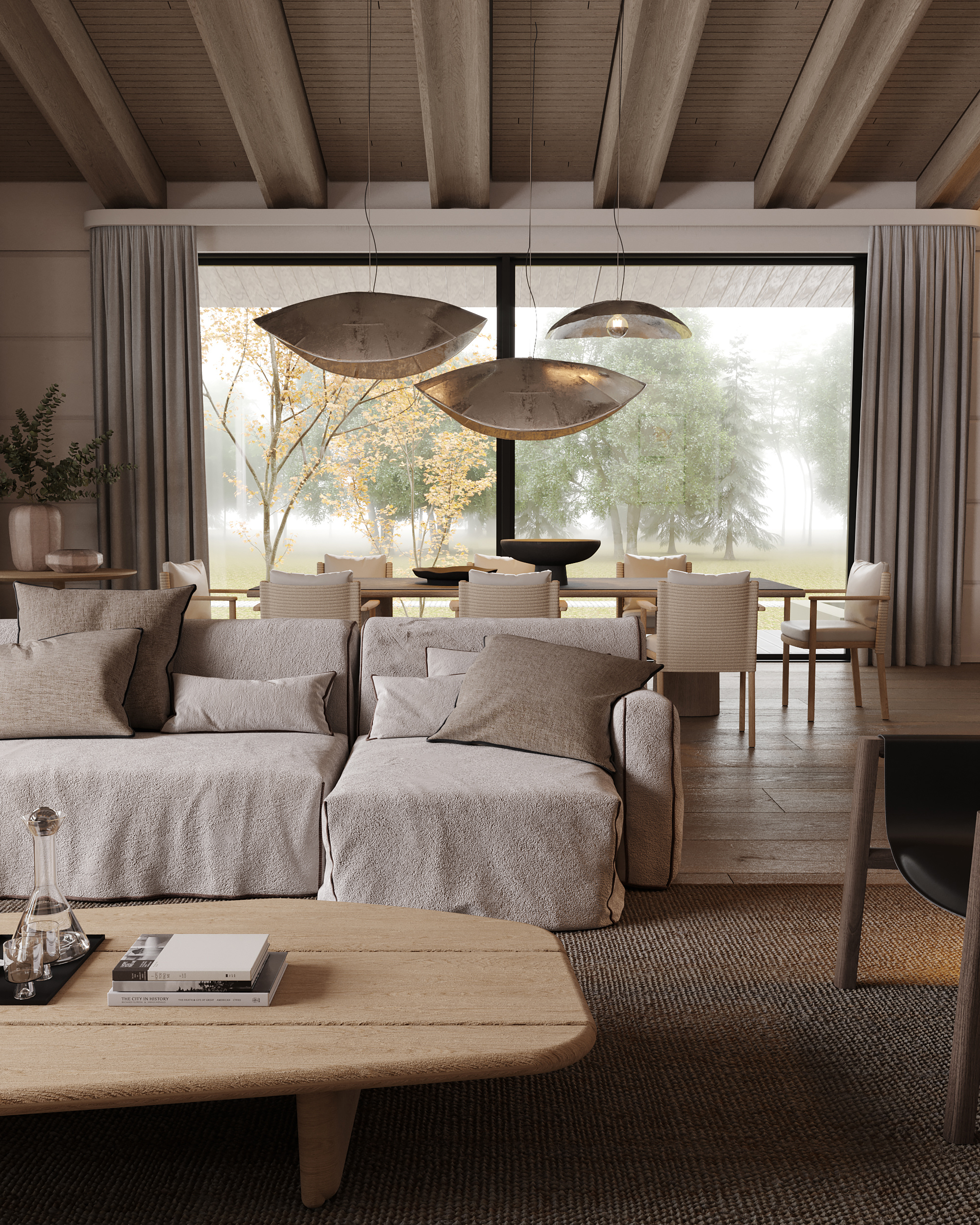 Проект представляет собой современную интерпретацию традиционной деревенской избы, предлагая новое видение роскоши: расслабление и умиротворение, вдали от шума и забот повседневной жизни, в атмосфере, вдохновленной природными формами и предметами ремесла. Ключевая особенность проекта – использование бруса с крупным, нестандартным сечением (600 × 400 мм), изготовленного на заказ в Сибири. Этот массивный брус выглядит основательно и сомасштабен размерам дома (общая площадь которого составляет 1069 м², а высота потолков достигает 7,1 м), что отсылает нас к классическим деревянным домам северных регионов. В двускатную кровлю традиционной формы искусно интегрирован световой фонарь, наполняющий внутреннее пространство светом и воздухом.