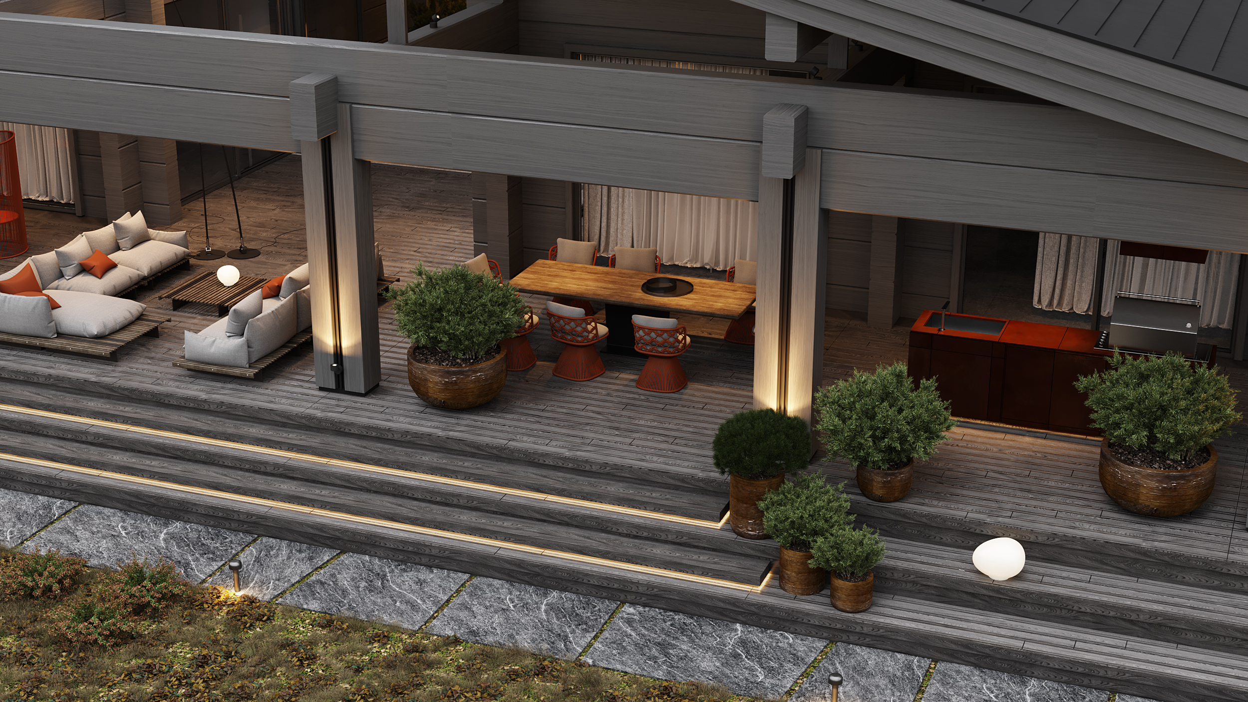 Дом площадью 650 м² расположен на живописном участке с собственной береговой линией и является частью масштабной загородной резиденции, обеспечивающей высокий уровень комфорта и сервиса, включая причал для яхт и тщательно продуманную инфраструктуру. Это не минималистичная вилла, а полноценное поместье: здесь найдется место для сада в английском стиле с декоративными травами и злаками, оранжереи, спортивного комплекса и даже частного ресторана с большой детской игровой зоной.